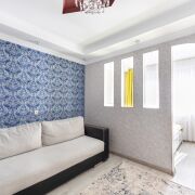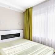 • Большая светлая комната разделена на две функциональные зоны: спальня с двуспальной кроватью и рабочим местом + уютная гостиная с раскладным диваном.