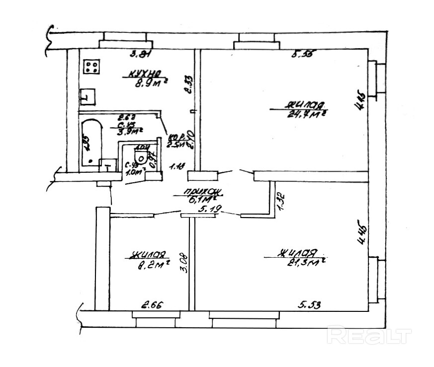 Трехкомнатная квартира с раздельными комнатами в благоустроенной деревне.