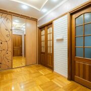 - Ремонт выполнен с вниманием к деталям: натуральный деревянный паркет в жилых комнатах, плитка на кухне и в санузлах - сочетание долговечности и практичности. Подвесные потолки с точечным освещением создают мягкий световой контур, а в коридоре декоративная отделка под фактурный камень делает пространство не просто проходным, а оформленным и законченным. Установлены ПВХ окна, входная дверь металлическая