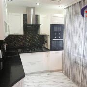 -Большая кухня площадью 8,3 кв.м. станет сердцем квартиры: здесь установлен удобный дубовый кухонный гарнитур, на полу - практичная современная плитка, вся техника фирмы Bosh, стиральная машина спрятана в гарнитуре.