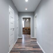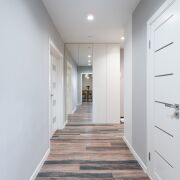 В просторном  коридоре установлен   шкаф – купе  с организованной системой хранения, напольное покрытие плитка и ламинат