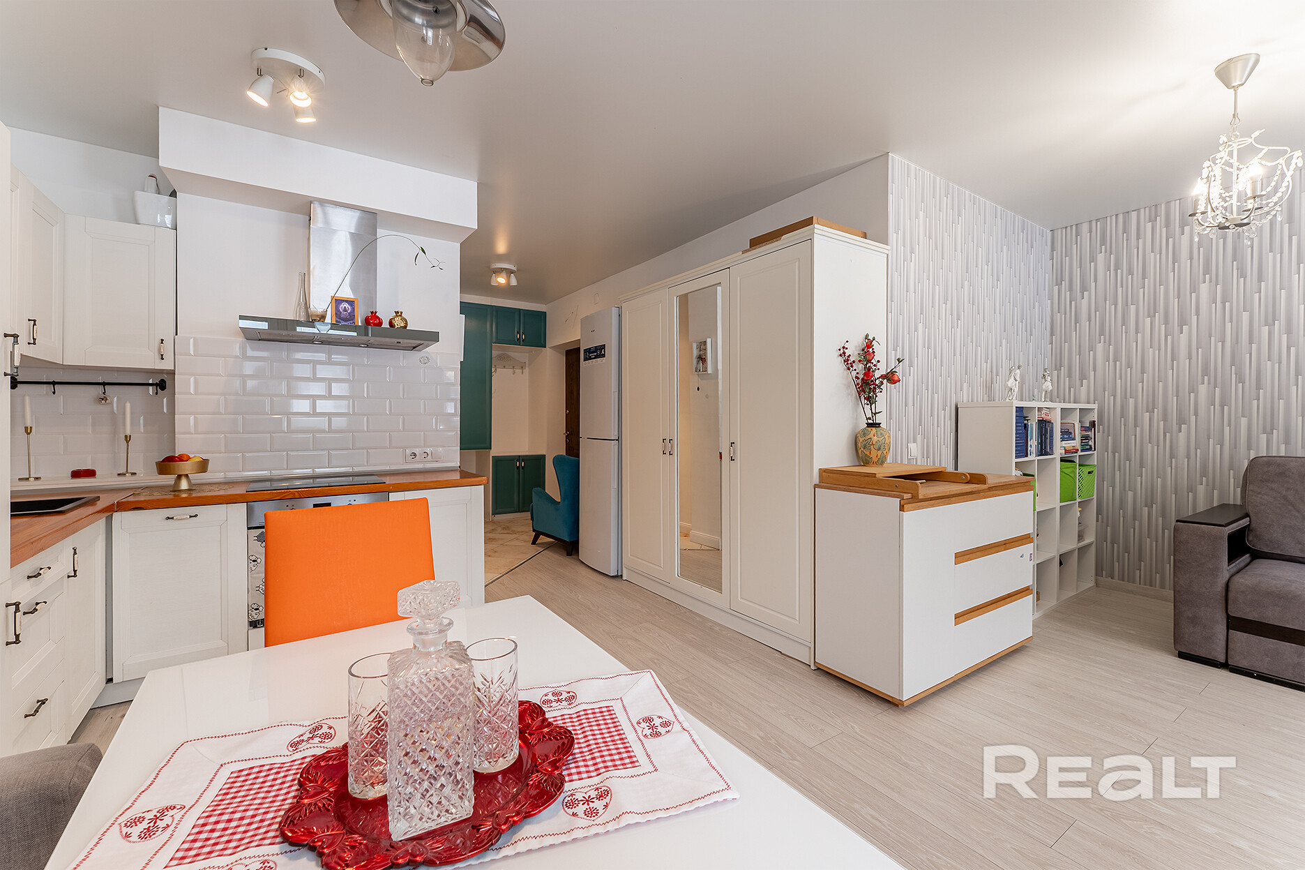 На полу ламинат, стены покрашены, встроенная кухня с техникой, санузел облицован плиткой в