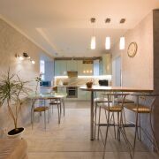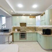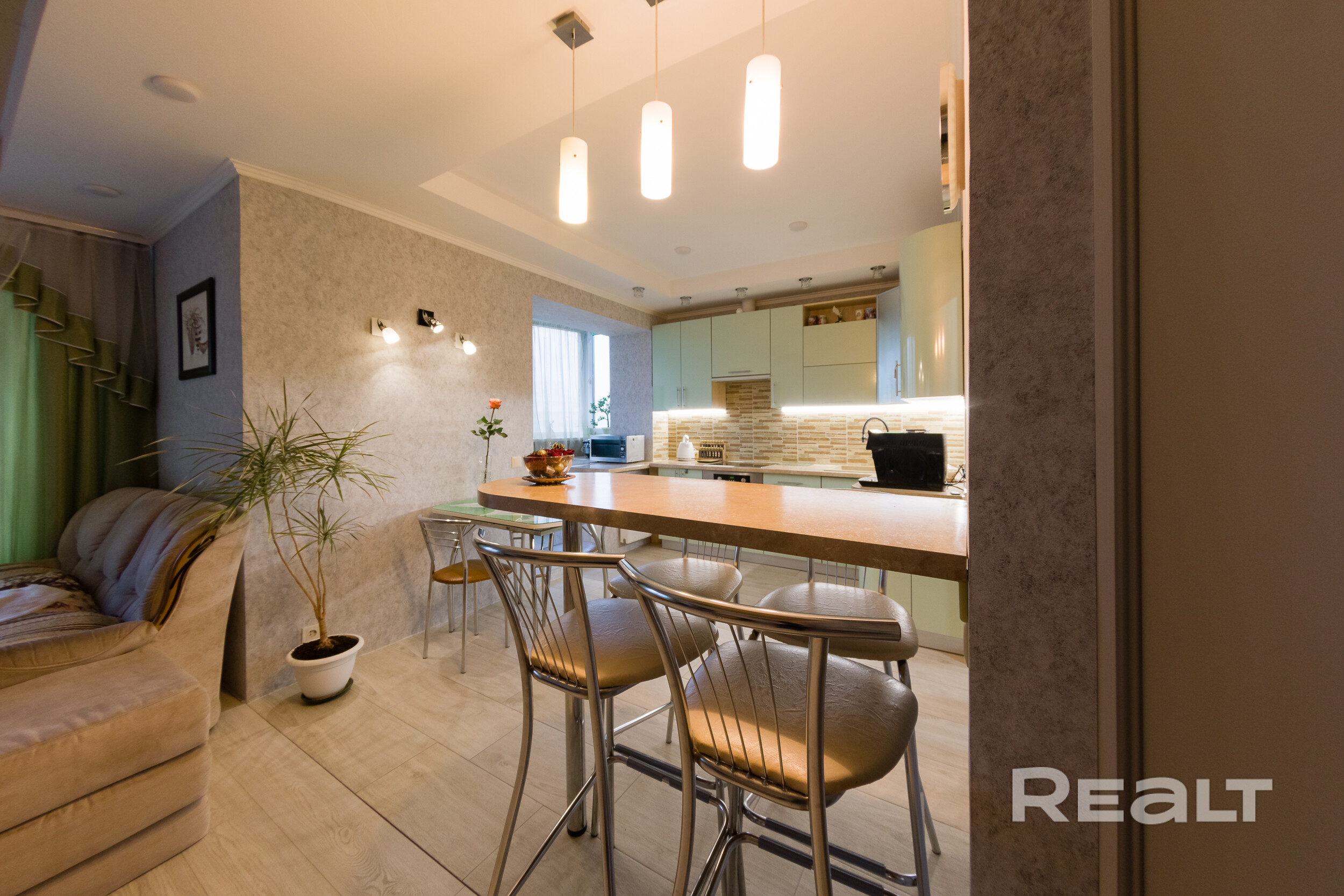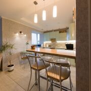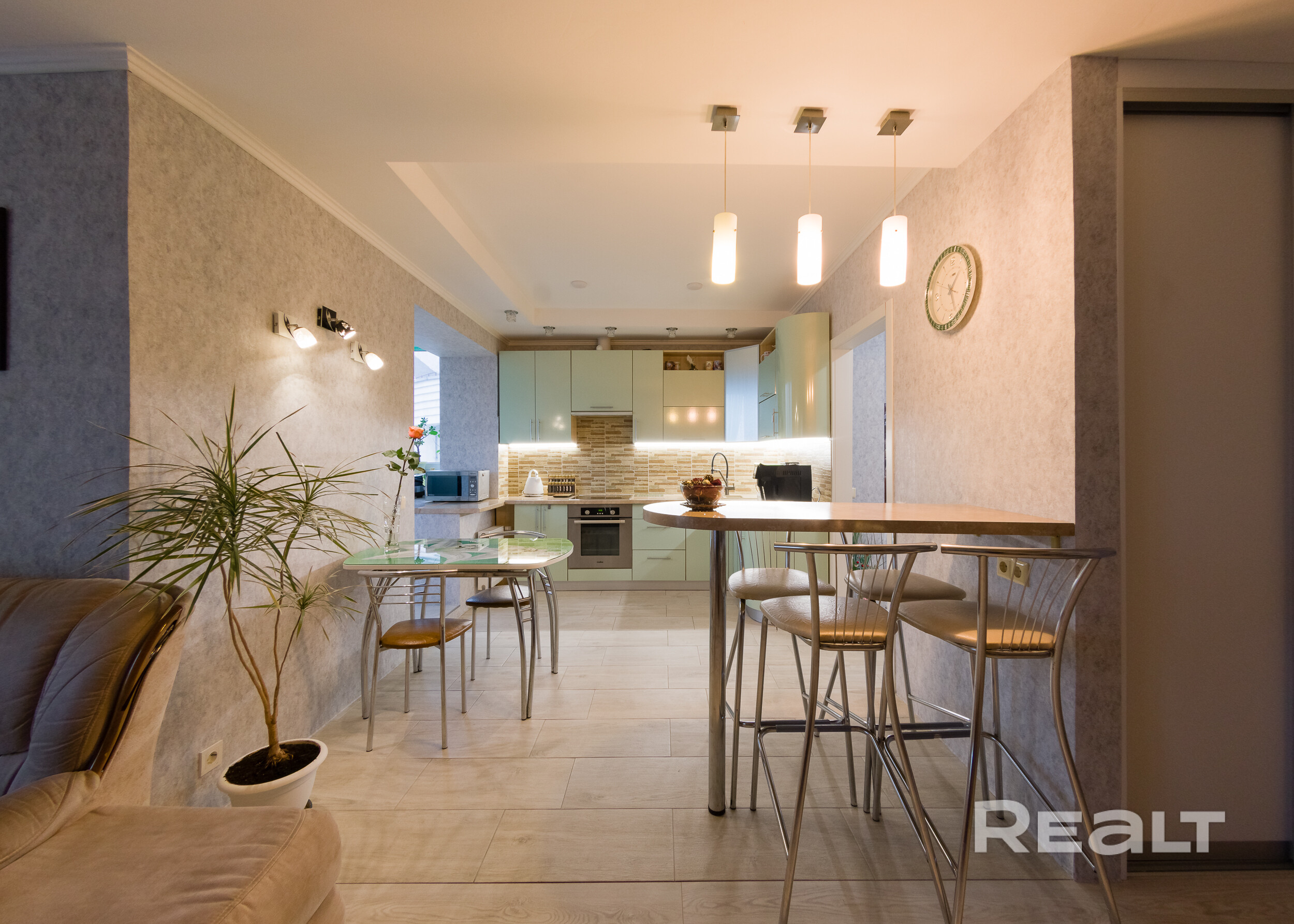 - Встроенная техника на кухне: духовой шкаф, варочная поверхность, вытяжная система, посудомоечная машина и удобная барная стойка;