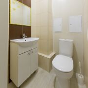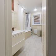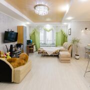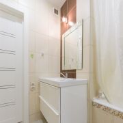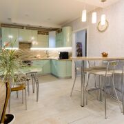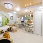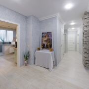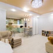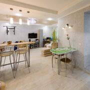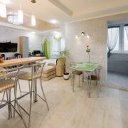 - Современный качественный ремонт: комбинация плитки и ламината на полу, качественные натяжные потолки и гипсокартонные конструкции;