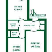 Общая площадь квартиры 50,2 м2, комнаты 13,6 м2 и 16,1 м2, кухня 9 м2., санузел раздельный. Есть счётчики на воду. Обустроенный подвал.