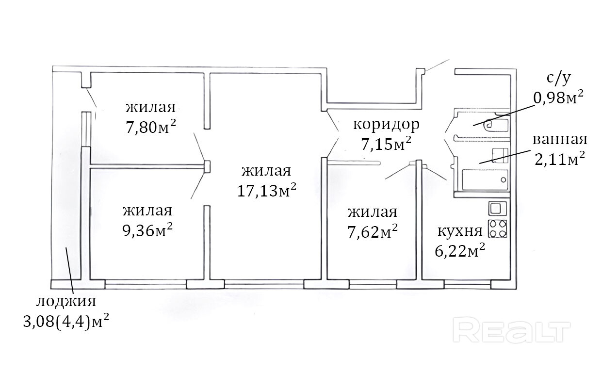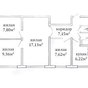 В квартире предусмотрены три изолированные комнаты и одна общая гостиная. Такая конфигурация позволяет организовать полноценную детскую, спальню и рабочий кабинет. В качестве дополнительного преимущества за квартирой закреплено подвальное помещение для хранения сезонных вещей.