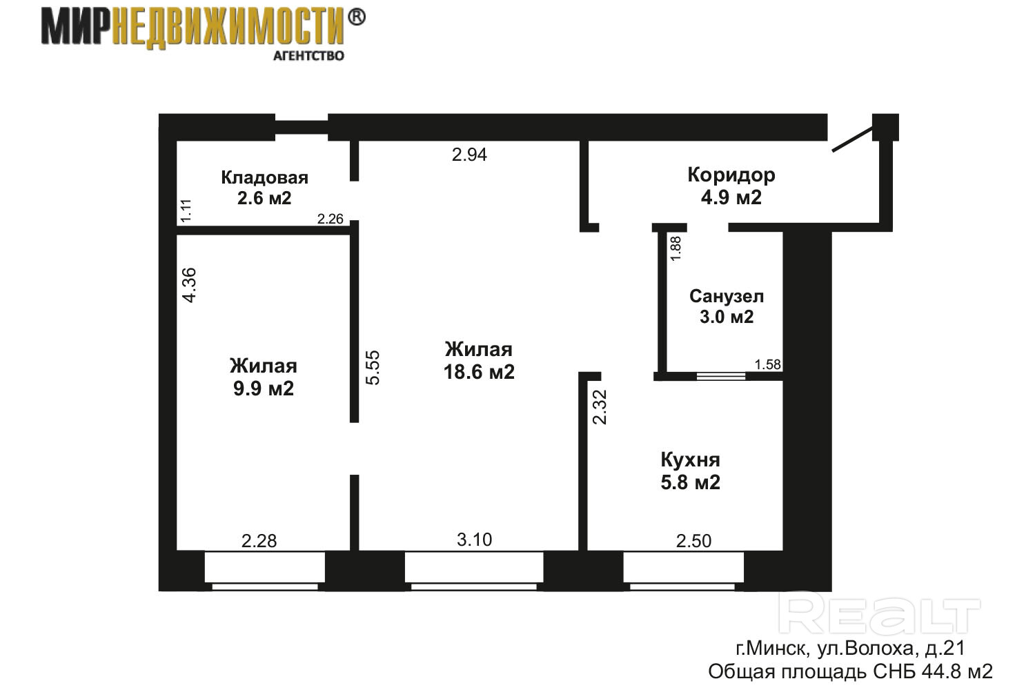 Общая площадь  44,8 кв.м., жилая площадь 31,1 кв.м., кухня  5,8 кв.м. Высота 2,52 м. Есть кладовая.