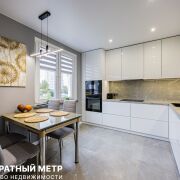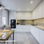 Современная кухня 10.2 м.кв, оборудована современным кухонным гарнитуром, фасады МДФ крашенный, доводчики и подъёмные механизмы Blum. Оснащенна высококачественной встроенной техникой, подойдет как для кулинарных экспериментов, так и для приемов гостей: холодильник, индукционная варочная поверхность, духовой шкаф и СВЧ печь Electrolux, посудомоечная машина Bosh, встроенная вытяжка и подсветка рабочей зоны.