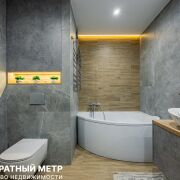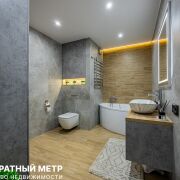Роскошный совмещённый санузел 7.6 м.кв. облицован керамогранитной плиткой, оборудован угловой ванной, хозяйственными шкафами скрытого монтажа, установлен бойлер, стиральная машина, унитаз с инсталляцией и вихревой системой слива «Торнадо».