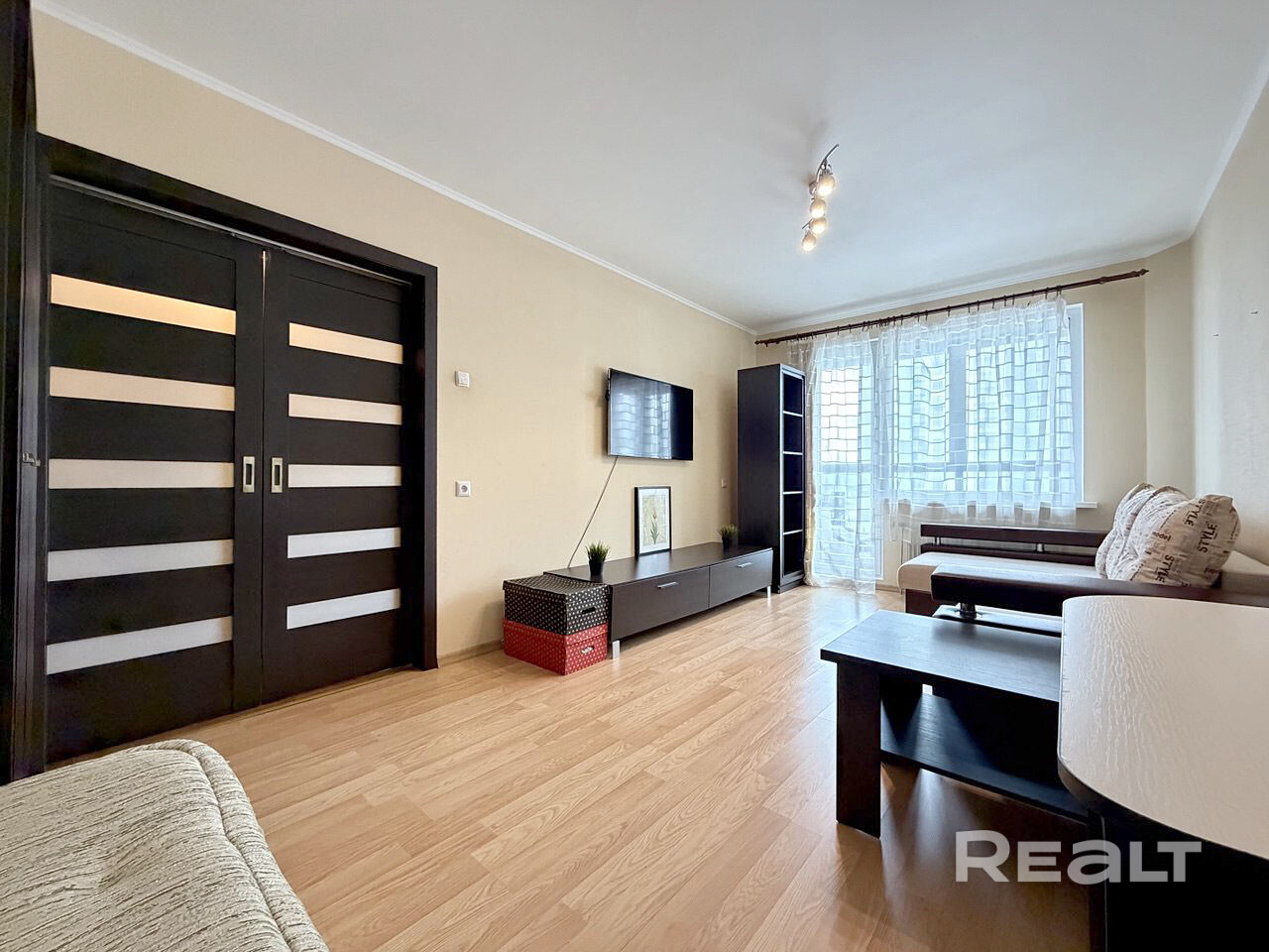 В комнате есть два дивана, тумба под TV, телевизор, отдельно стоящий шкаф, стеллаж, журнальный и письменный столы.