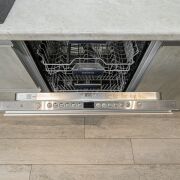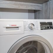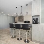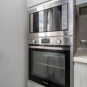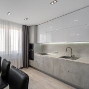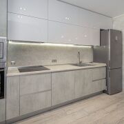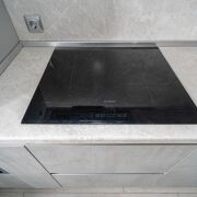 Кухня полностью оснащена встроенной бытовой техникой: индукционная варочная панель, холодильник, духовой шкаф, микроволновка, посудомоечная машина, измельчитель для пищевых отходов, кофемашина.