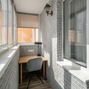 Балкон утеплен, двойные стеклопакеты, пол с подогревом, оборудован рабочей зоной с комфортным креслом.