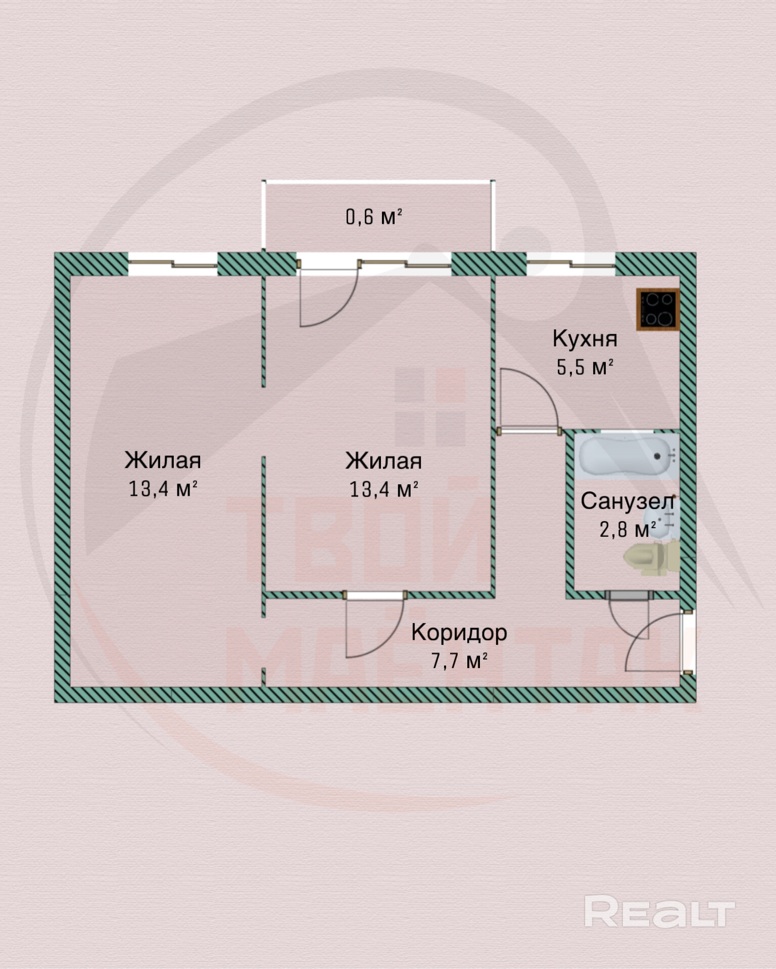 В квартире не большая, но уютная и светлая кухня 5,5 кв.м., прихожая 7,7 кв.м., две изолированных жилые комнаты по 13,4 кв.м, совмещенный сан. узел 2,8 кв.м., так же последний этаж дает дополнительные возможности для ваших дизайнерских