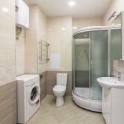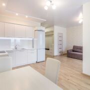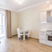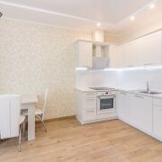 - Встроенная кухня с техникой (вытяжка, варочная панель, духовой шкаф, холодильник), обеденная группа