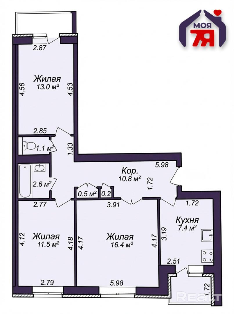 -Раздельный санузел добавляет удобства, а просторный коридор позволяет разместить вместительные системы хранения, освобождая жилые комнаты.