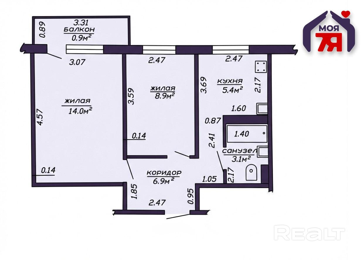 - Общая площадь квартиры составляет 38,3 м2, из которых жилая — 22,9 м2. Квартира состоит из двух раздельных комнат (14,0 м2 и 8,9 м2). Кухня площадью 5,4 м2 со встроенной техникой, которая остается будущим владельцам, также добавляет удобства.