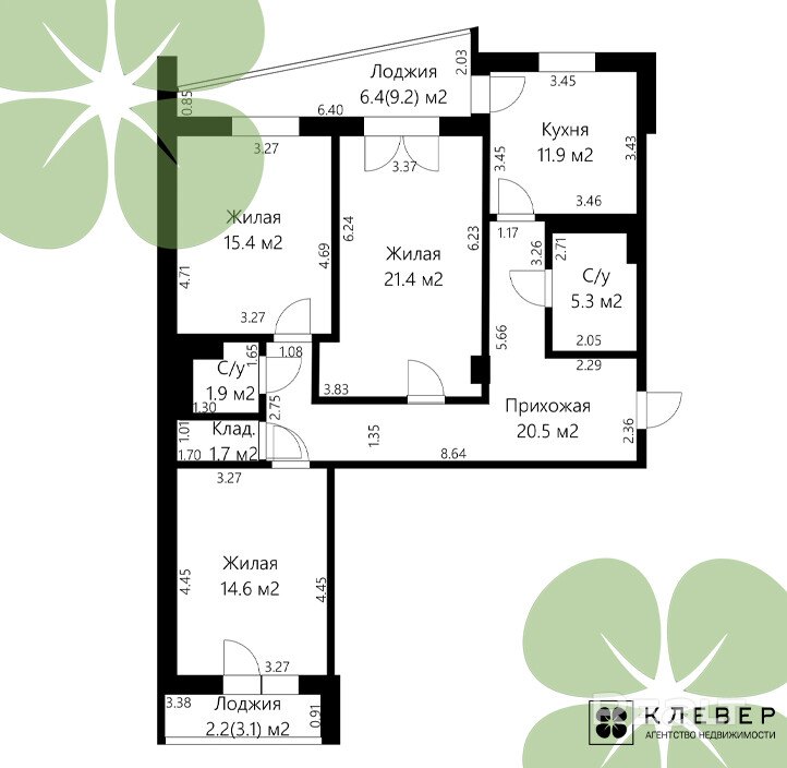 Простор: 101.3 м2 общей площади (жилая — 51.4 м2), кухня 11.9 м2. Большой коридор для системы хранения или потенциальной перепланировки.