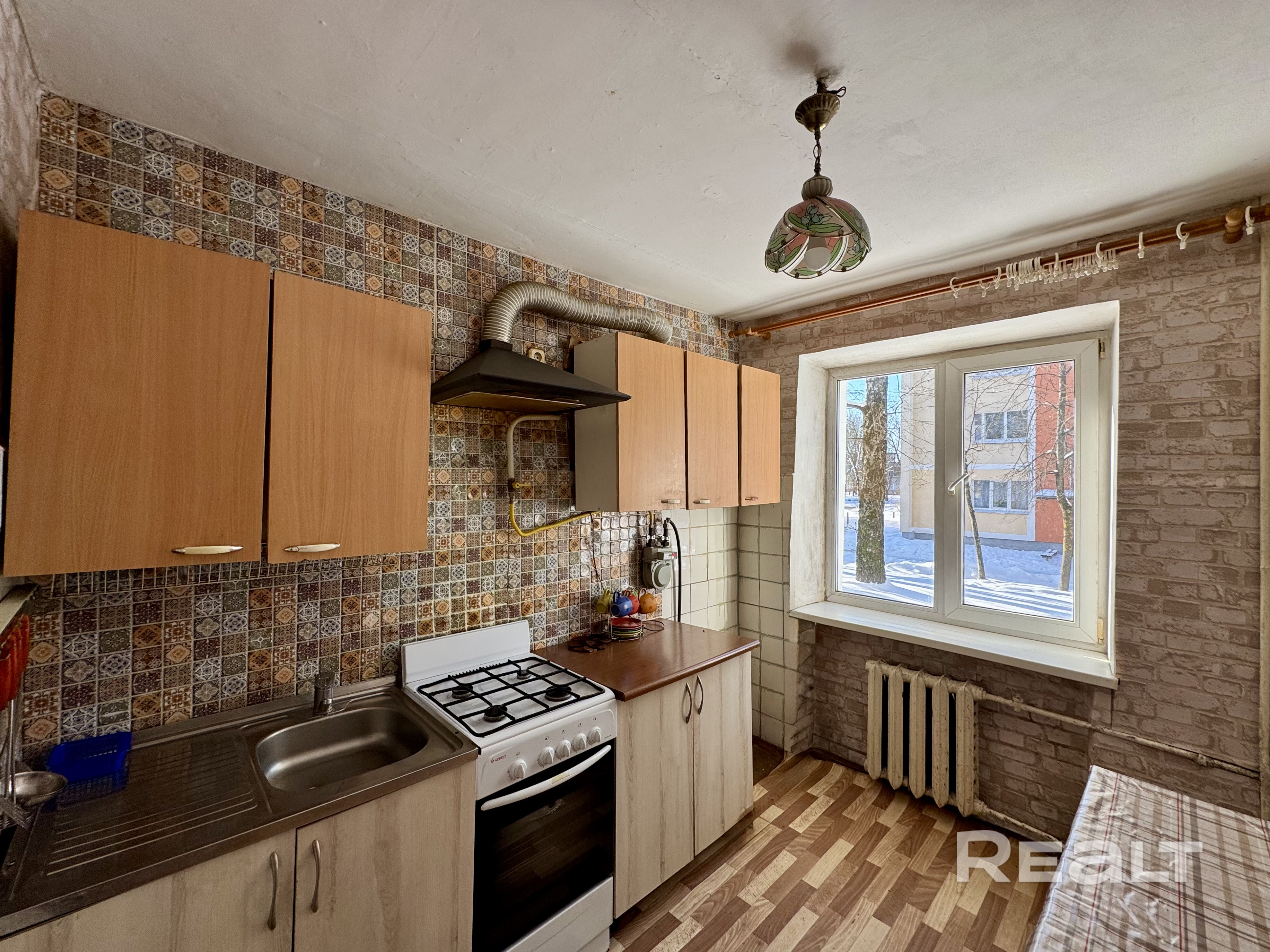 Кухня оборудована необходимой техникой: газовая плита, холодильник. Предусмотрено достаточное количество мест для хранения кухонный стол. Высота потолков 2,54 м.