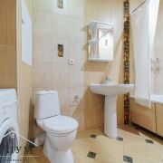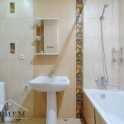 Санузел с современным кафелем, сантехникой, ванной.   Наличие минимального набора необходимой мебели и много свободного пространства под дополнительные предметы интерьера.