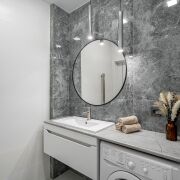 -Пол в жилых комнатах и гостиной выполнен из качественного ламината; в кухне, прихожей и санузле – широкоформатный керамогранит.