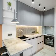 -Современная кухня со встроенной техникой: духовой шкаф, электрическая варочная панель, вытяжка, холодильник, посудомоечная машина.