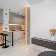 -Современная кухня с барной стойкой и встроенной техникой: духовой шкаф, варочная поверхность, вытяжка, холодильник.