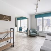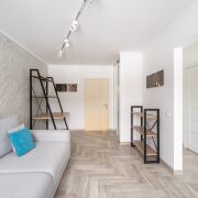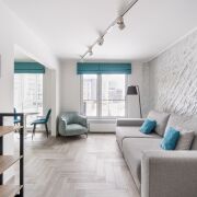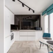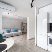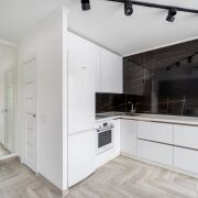 - Потолки ровные, светлые, трековое освещение — можно менять сценарии света.
