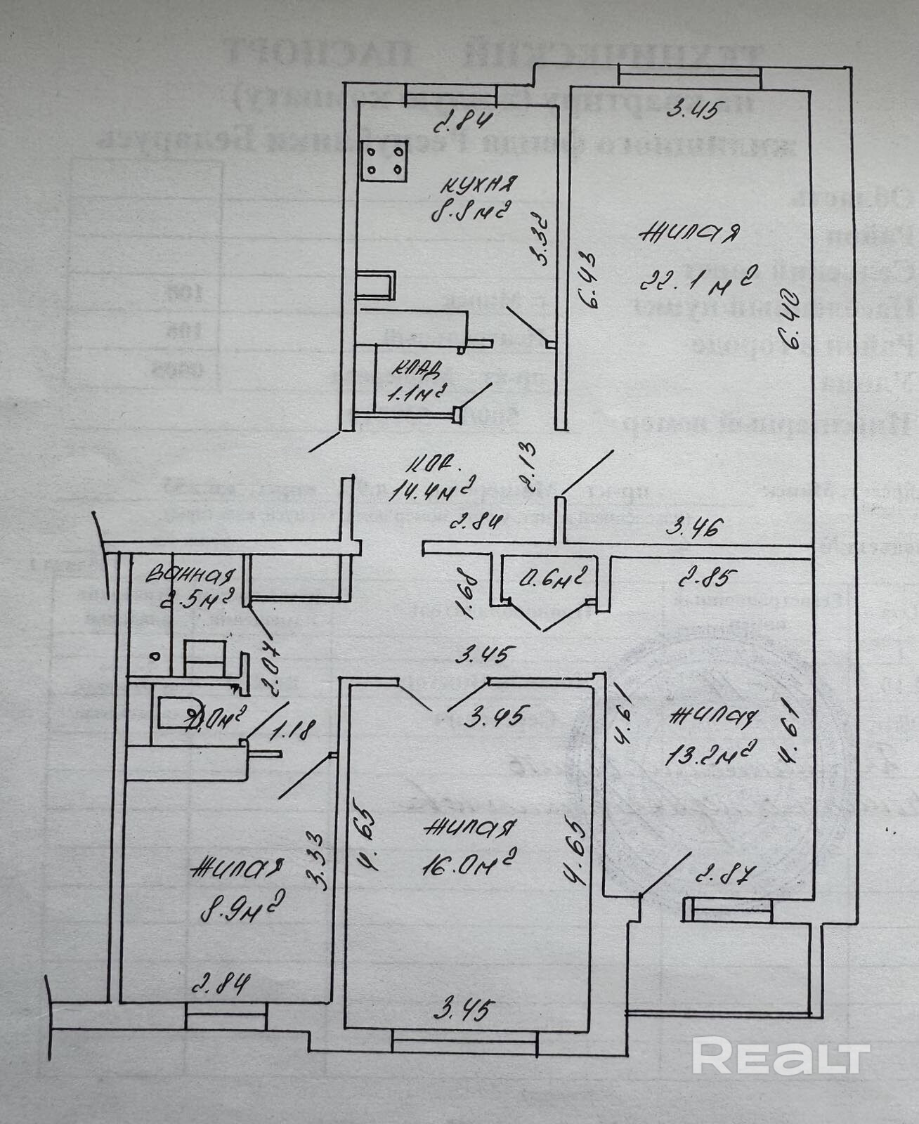 Площадь по СНБ – 9,2 кв.м., Общая площадь: 88,6/60,2/8,8 кв.м.