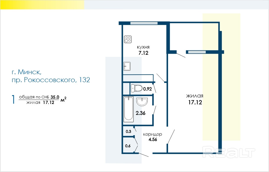 Фактическая площадь 35.0 м кв 7/9 этажей, под ремонт .