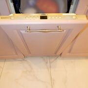 Кухня: стильный гарнитур с встроенной техникой — холодильник, морозильная камера, посудомоечная машина, духовой шкаф, варочная панель, вытяжка.