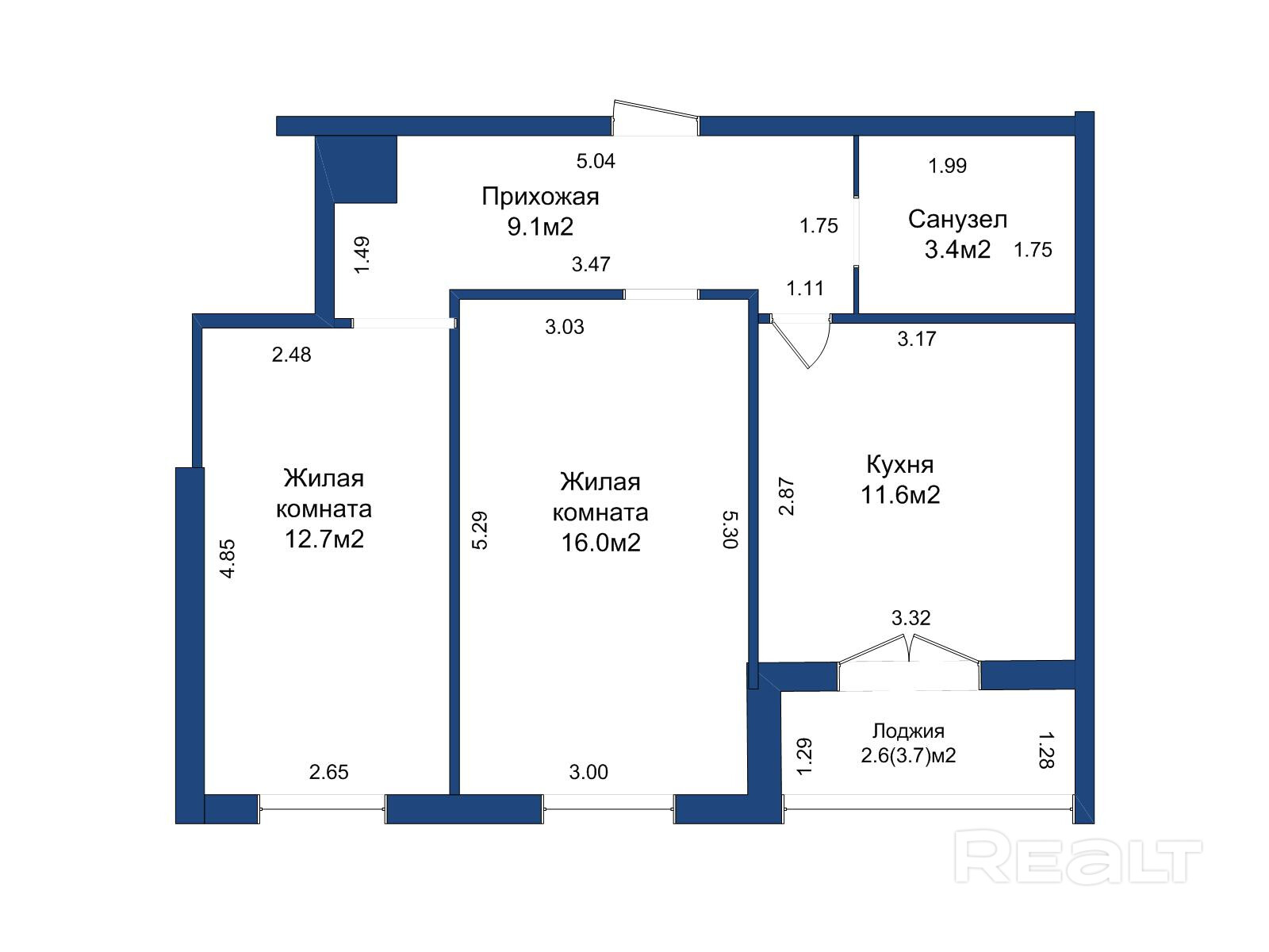 Практичная планировка: изолированные комнаты 12,7 м2 и 16 м2, большая кухня 11,6 м2
