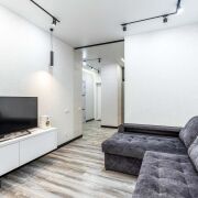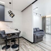 -Интерьер выполнен в едином современном стиле, без визуального шума и спорных решений. Кухня компактная, но функциональная: встроенная техника, подсветка рабочей зоны, фартук под камень, барная стойка вместо громоздкого стола - это экономит место и делает кухню удобной в повседневной жизни.