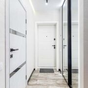 -Прихожая выдержана в общем стиле квартиры. Зеркальный шкаф увеличивает пространство и сразу решает вопрос хранения верхней одежды и обуви. Входная дверь массивная, с современными замками - ощущение надёжности с порога.