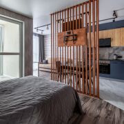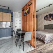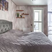 В квартире грамотная планировка: кухня с комфортной зоной для готовки, гостиная с диваном и телевизором, зонированное спальное место с кроватью и встроенным шкафом, санузел, вместительная гардеробная, прихожая, лоджия.