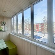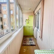 - Балкон застеклённый, утеплённый — с выходом и из зала, отделан белой вагонкой, деревянный пол: полноценная дополнительная комната для отдыха, хранения или мини-сада.