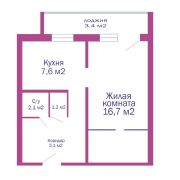 Площадь: СНБ-36,9 м2, общая - 33,5 м2, жилая - 16,7 м2, кухня - 7,6 м2, потолки- 2,5