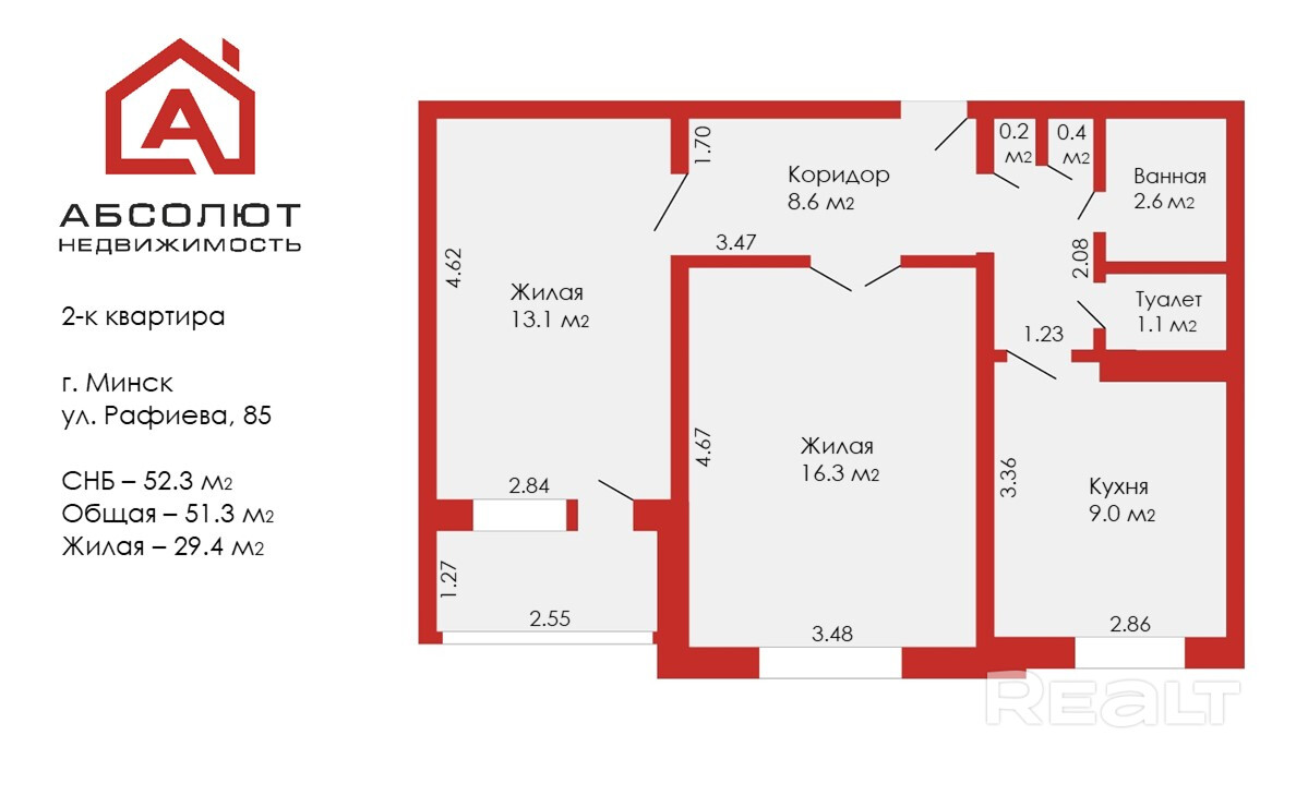 Общая площадь квартиры – 51, 3 м.кв, жилая – 29,4 м.кв, кухня – 9,0 м.кв, потолки – 2,61м.