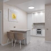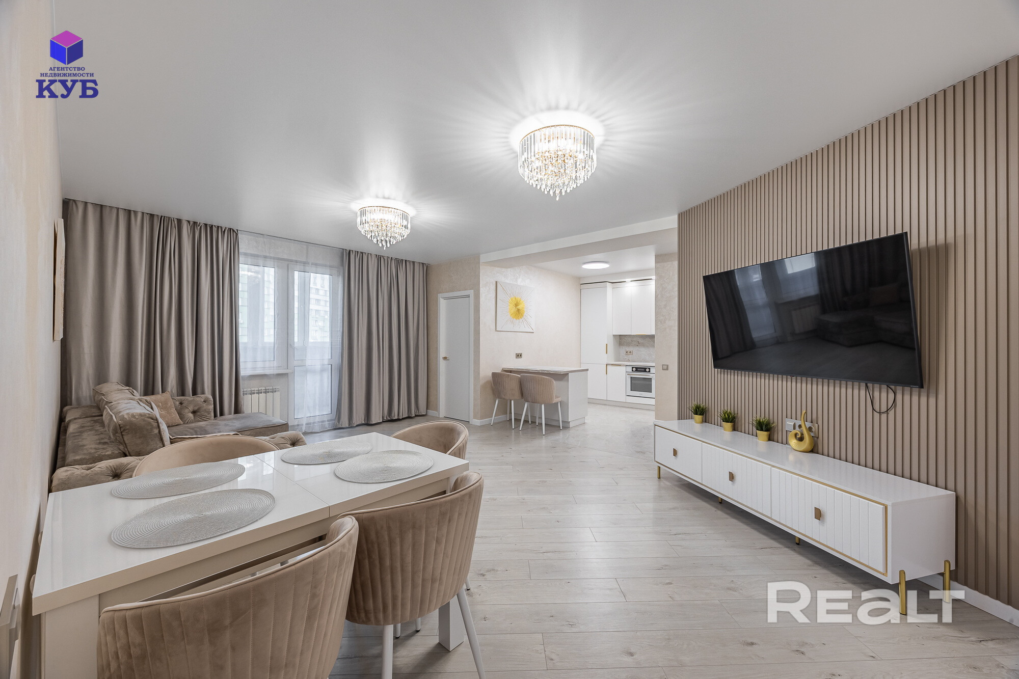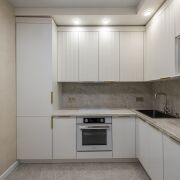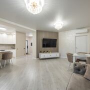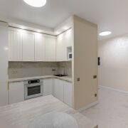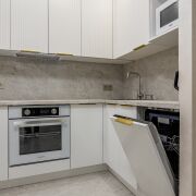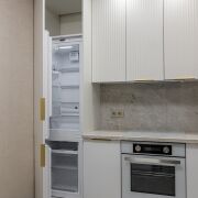 - Полностью оборудованная встроенная кухня: индукционная варочная панель, духовой шкаф, ВЧ, посудомойная машина и двухкамерный холодильник