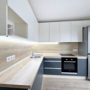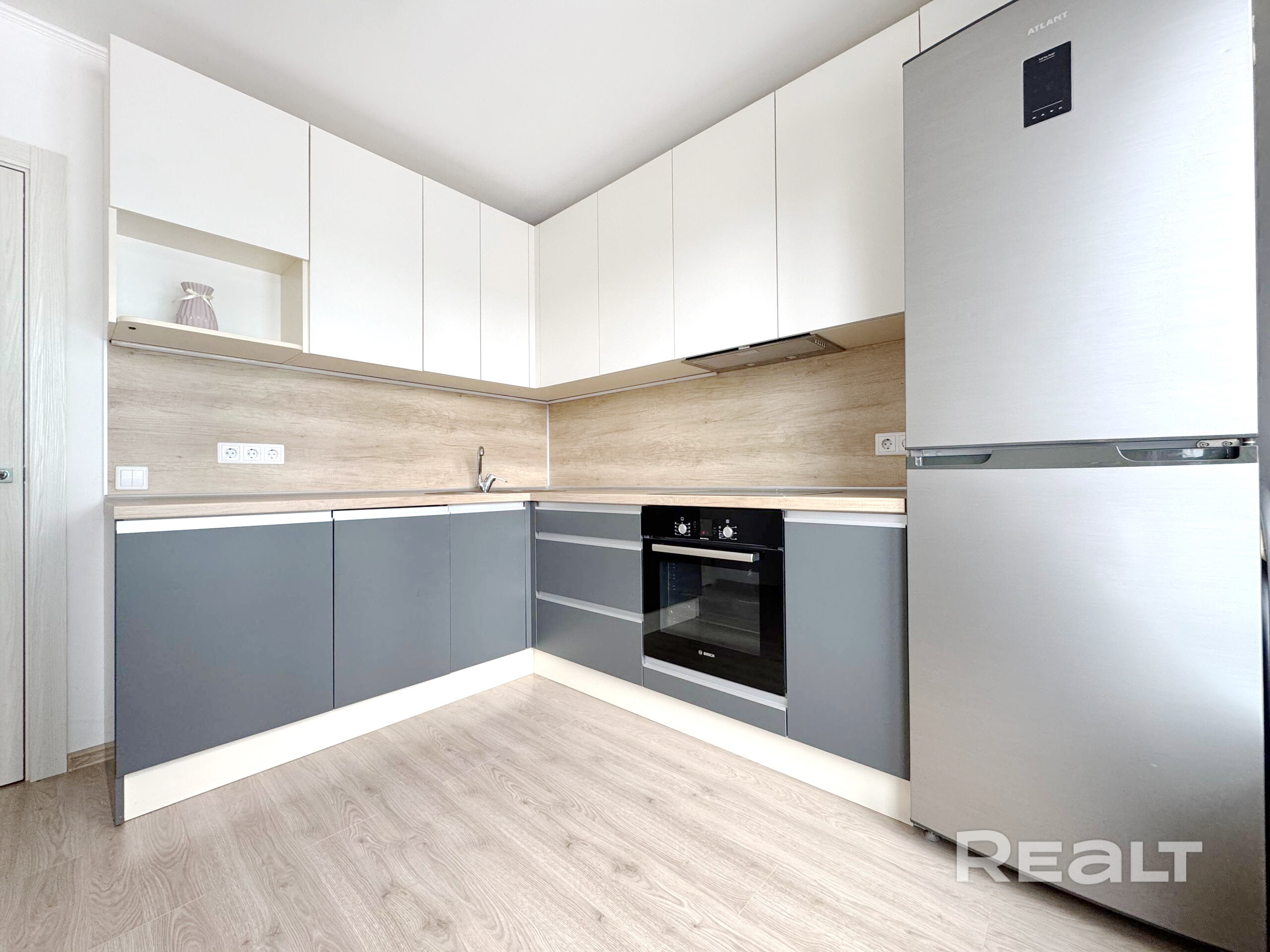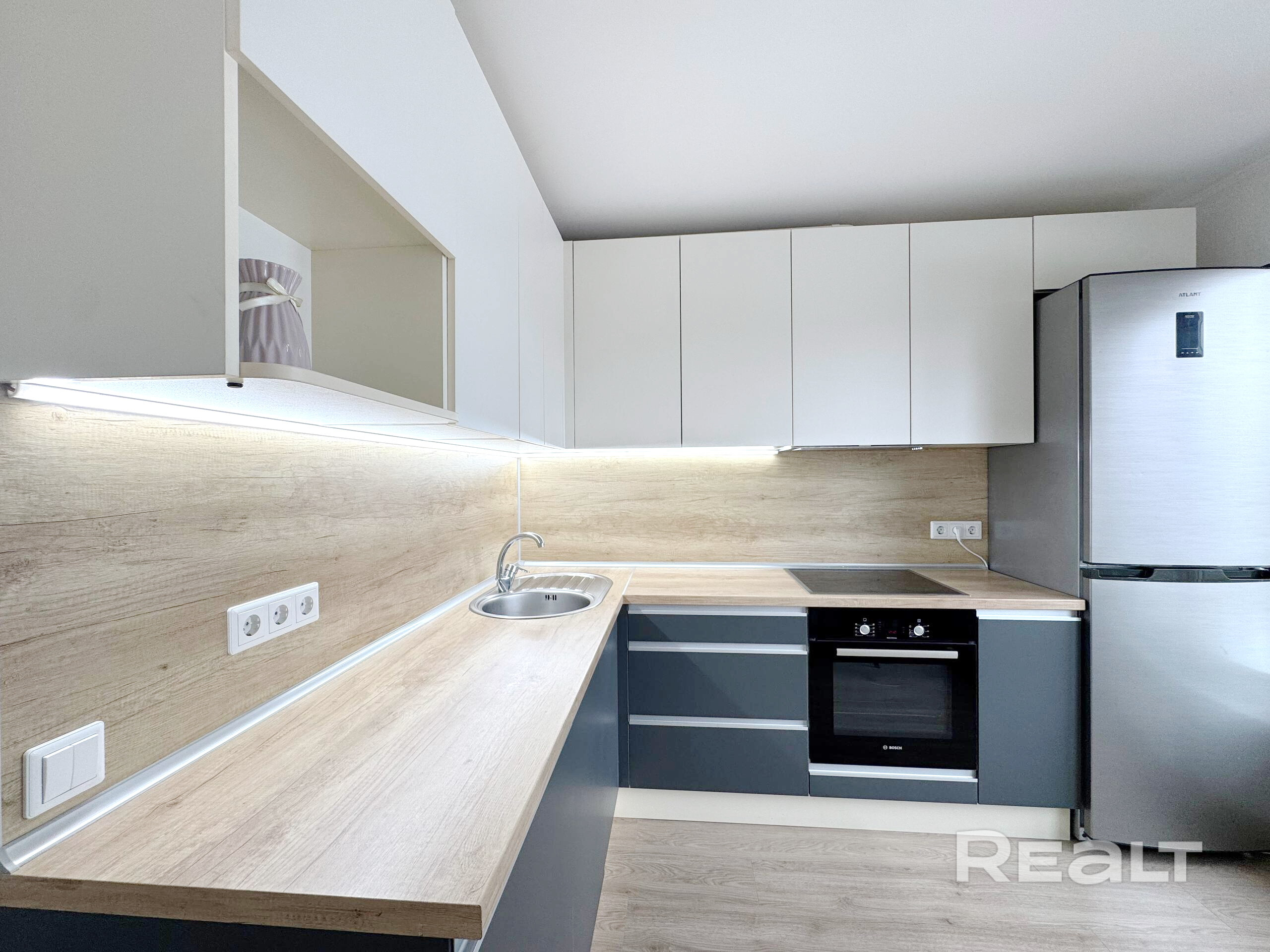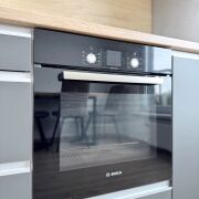 Кухня укомплектована всей необходимой бытовой техникой: духовой шкаф и варочная панель Bosch, посудомоечная машина SchaubLorenz, холодильник Атлант.