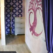 Спальня и рабочая зона легко разделяются тяжёлой шторой — приватность без перепланировки. Центр интерьера — авторская композиция «Древо жизни» из штукатурки: не просто декор, а настроение.