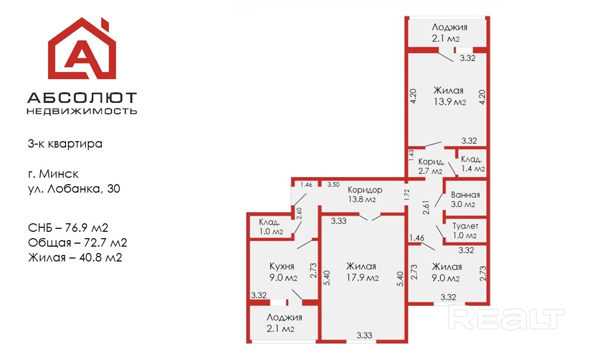 Площадь общая по СНБ 76.9 / жилая 40.8 / кухня 9.0 кв.м. Высота потолков - 2.43 м, 2-й этаж.