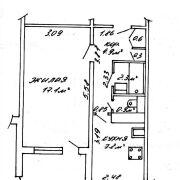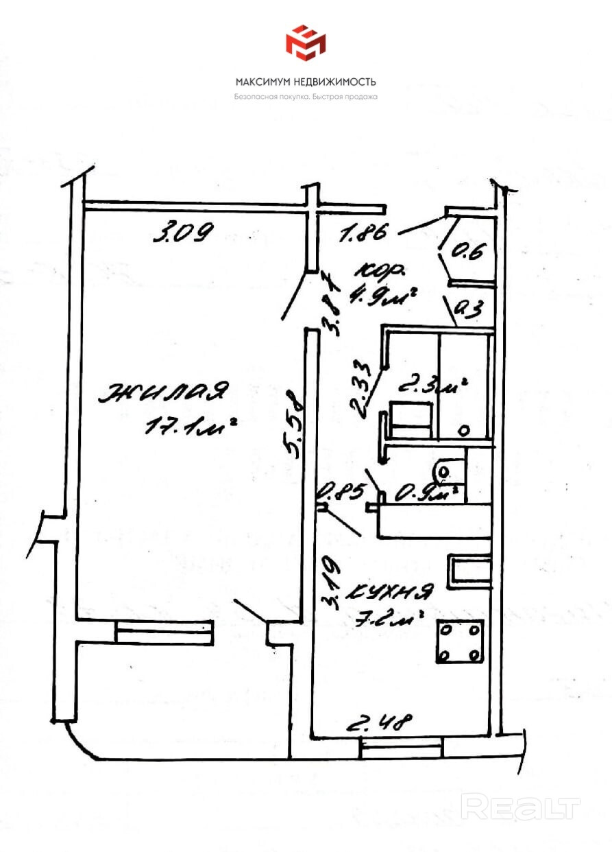 Общая площадь по СНБ — 35,4 м2 (жилая — 17,1 м2, кухня — 7,2 м2), высота потолков — 2,56 м.
