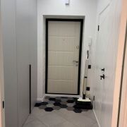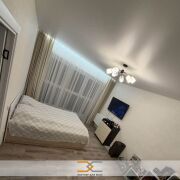 В комнате на полу ламинат. В кухне и санузле плитка. Везде натяжные потолки.