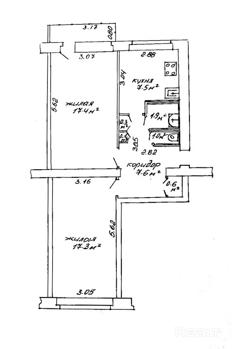 Двухкомнатная квартира с большими комнатами 17.3м2 и 17.4 м2 недалеко от центра.