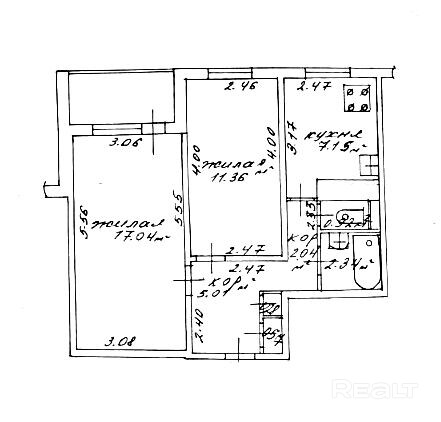 Кухня 7,15 м2, оборудована электрической варочной поверхностью и электрическим духовым шкафом.
