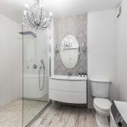 - В отделке использованы только премиальные материалы. Установлены итальянские двери с литой латунной фурнитурой и надёжным замком Union. Стены оформлены текстильными обоями итальянского производства, а пол и стены в ванной отделаны итальянской плиткой. Санфаянс бренда Jacob Delafon подчеркивает уровень качества. В душе установлена система тропического дождя. Освещение продумано до мелочей. Чешские люстры с 24-каратным золочением наполняют комнаты мягким светом. Выключатели и розетки эксклюзивные, итальянского производства.