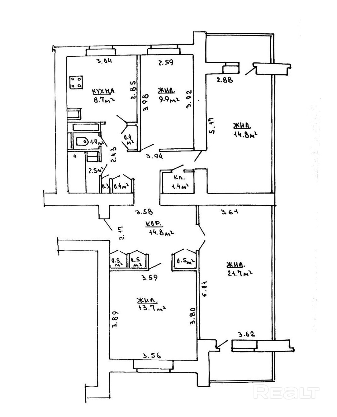 Площадь: 94,9 м2 (жилая 60,1 м2 + просторная кухня 8,7 м2).