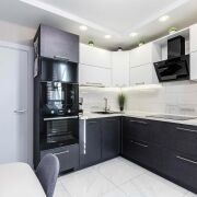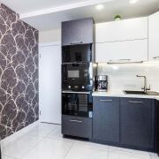 -На кухне есть встроенная техника; варочная панель, вытяжка, посудомоечная машина, микроволновка, телевизор, установлены две подсветки с датчиком «взмах руки». Пол: итальянская плитка с подогревом.