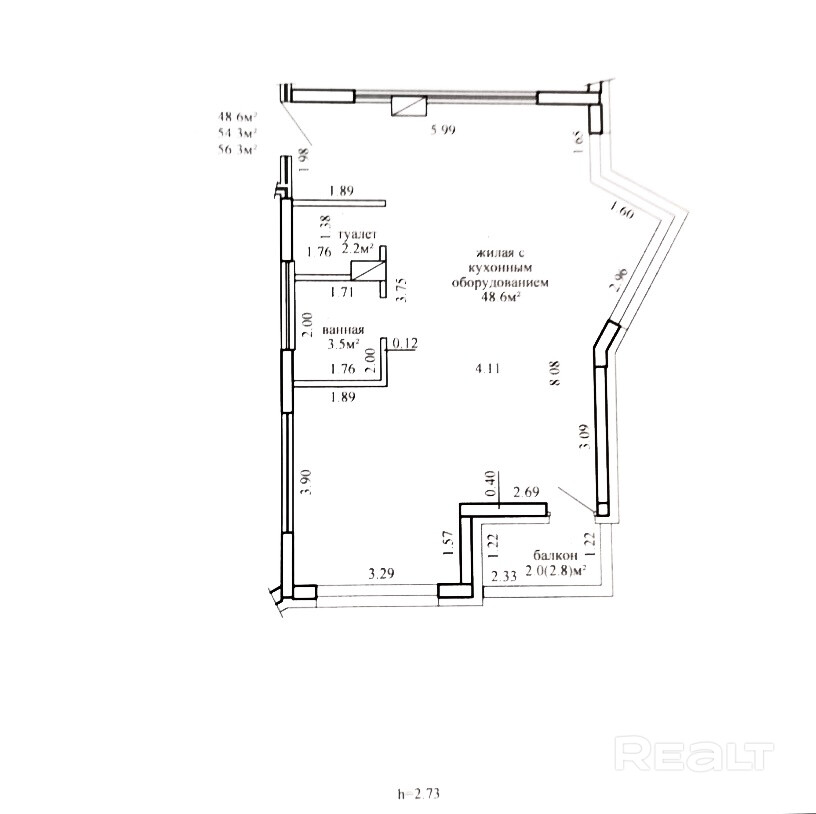 Общая площадь 54,3 кв.м., по СНБ 56,3 кв.м., жилая 48,6 кв.м
