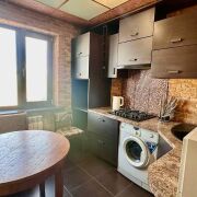 -Кухня площадью 8,3 кв. м - просторная и удобная. Угловой кухонный гарнитур с тёмными фасадами, фактурой кирпича и мозаичной плиткой в рабочей зоне выглядит современно и выразительно. Эргономика продумана: техника размещена логично, рабочая поверхность практична, освещение зоны готовки организовано грамотно.
